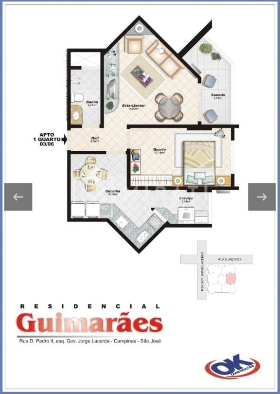 Apartamento 1 dormitório, sacada, cozinha, área de serviço e banheiro social.